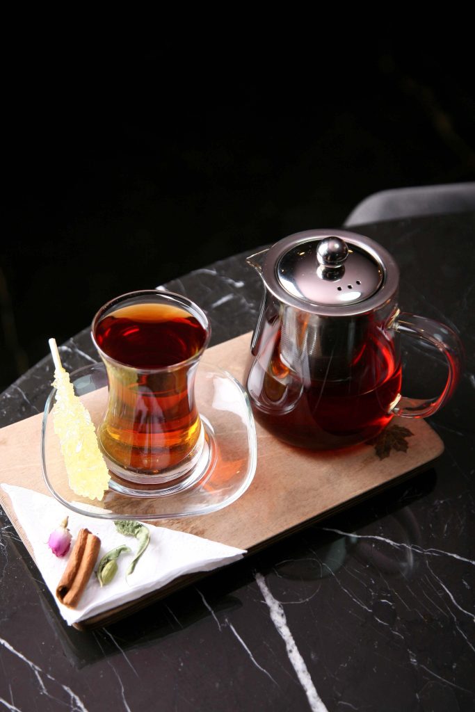 چای سیاه+شیر+زعفران+هل+گلاب+سیروپ گل رز