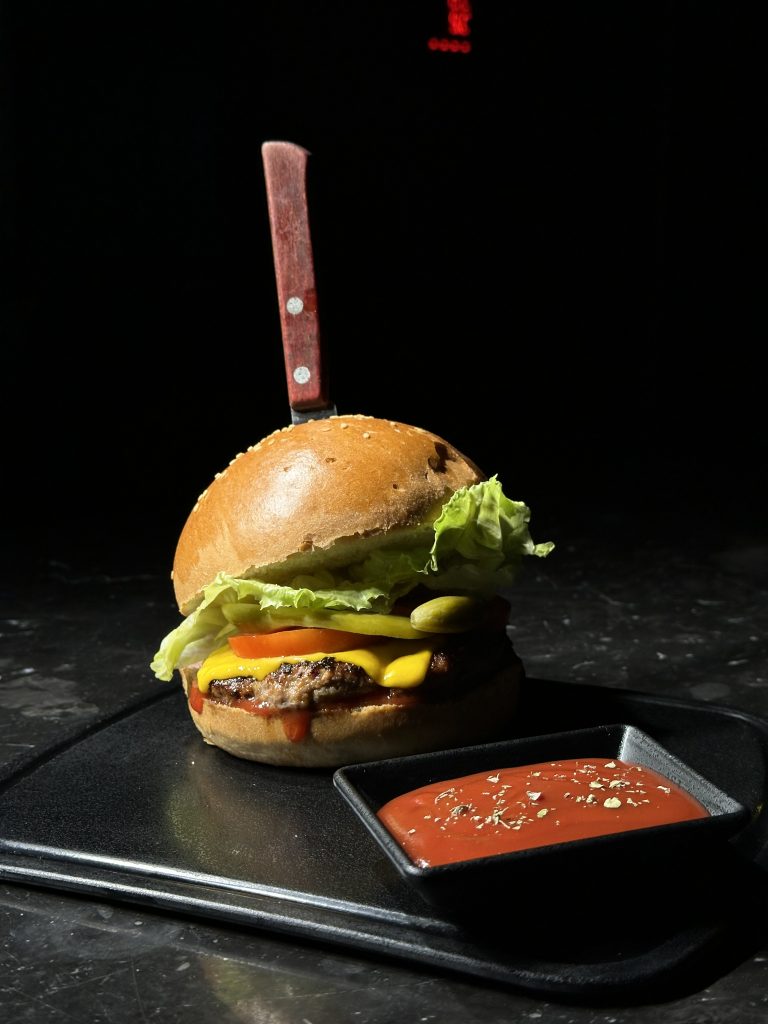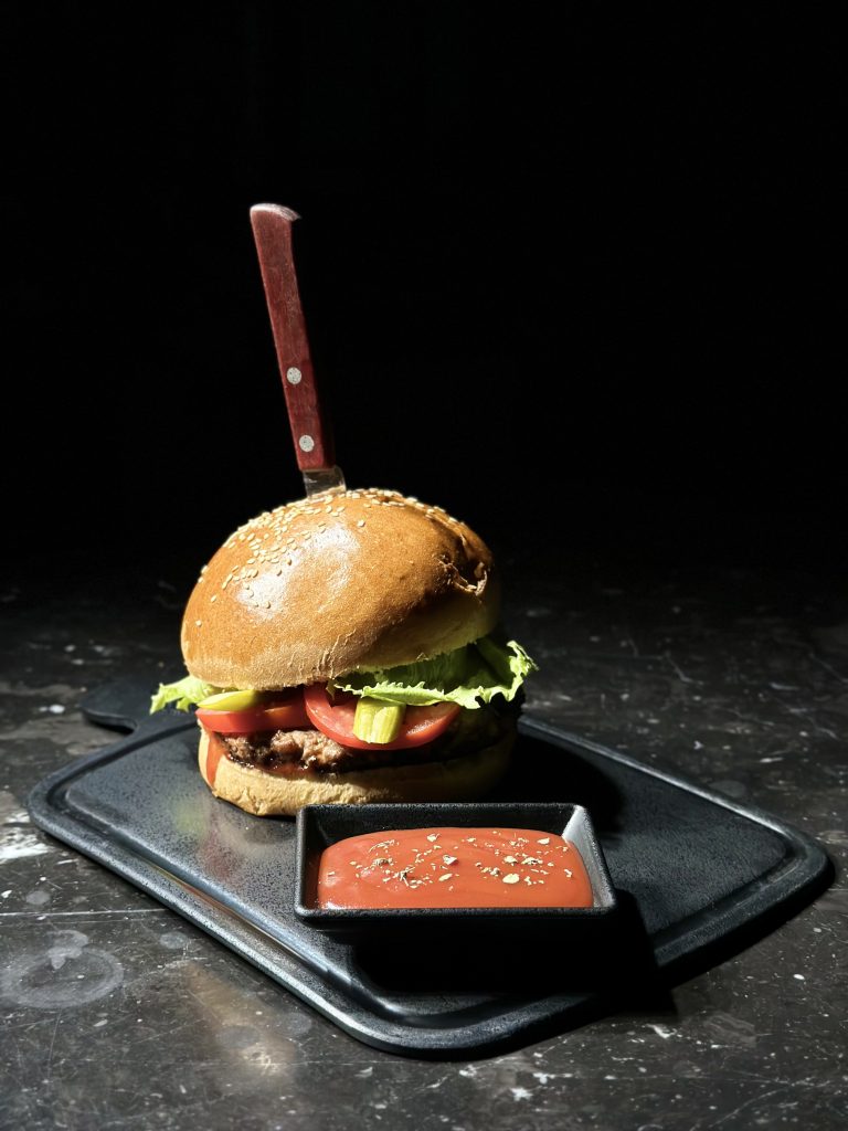 180گرم برگر دست ساز+گوجه+خیار شور+کاهو+پنیر گودا+سس