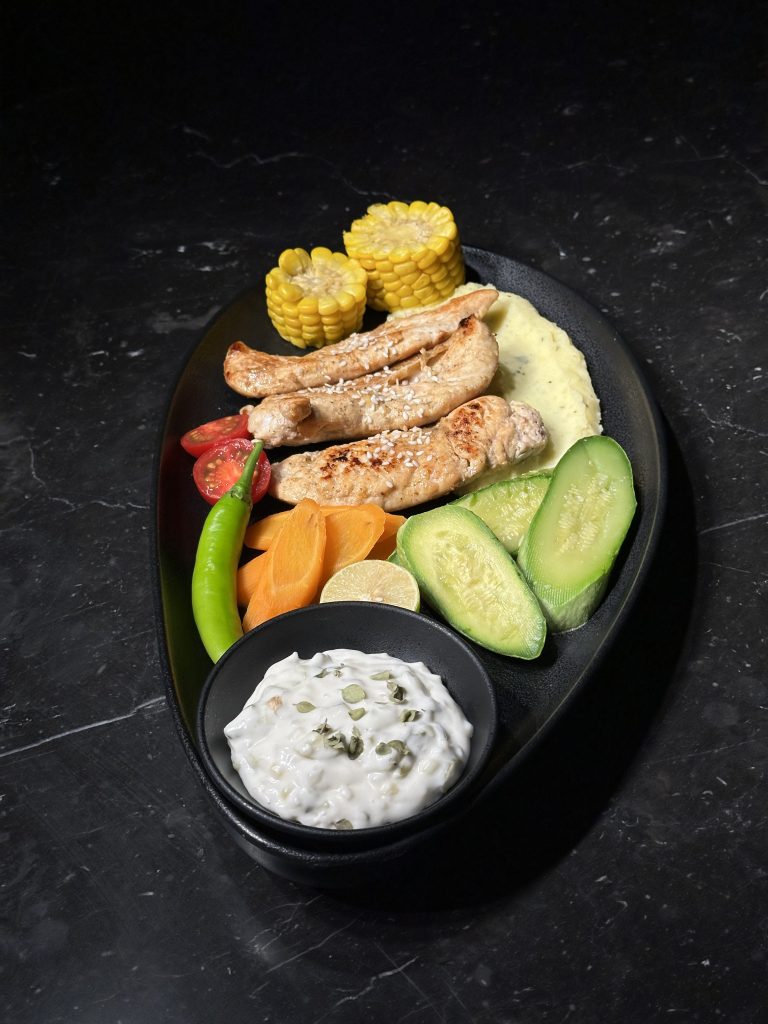 3 عدد فیله گریل+پوره سیب زمینی+دورچین سبزیجات+سس مخصوص