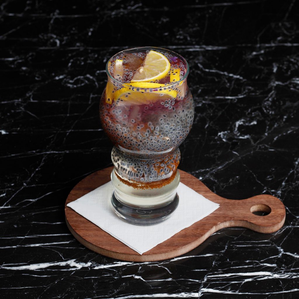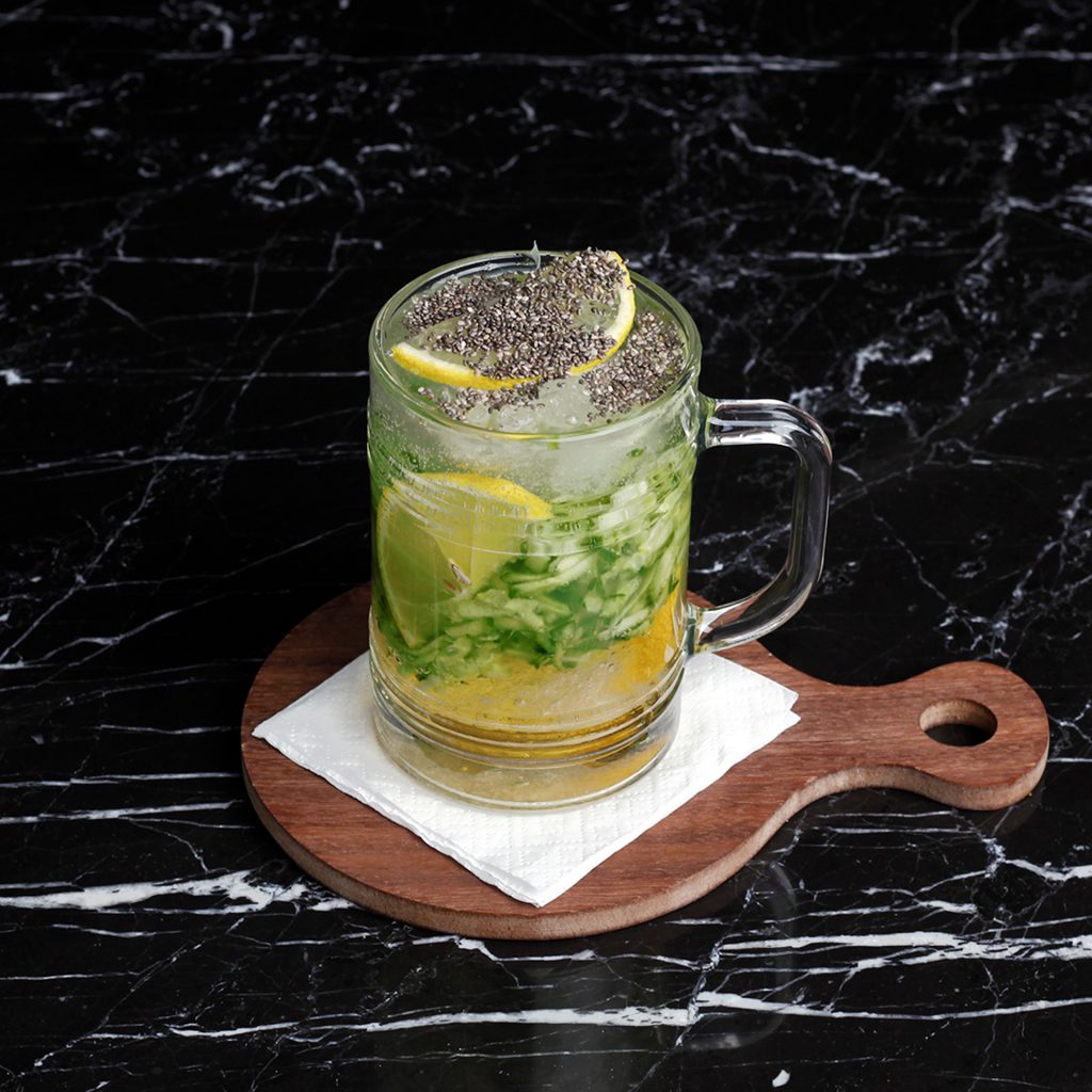 خیار+زنجبیل تازه+برگ نعنا+لیمو تازه+دانه چیا+آب سودا