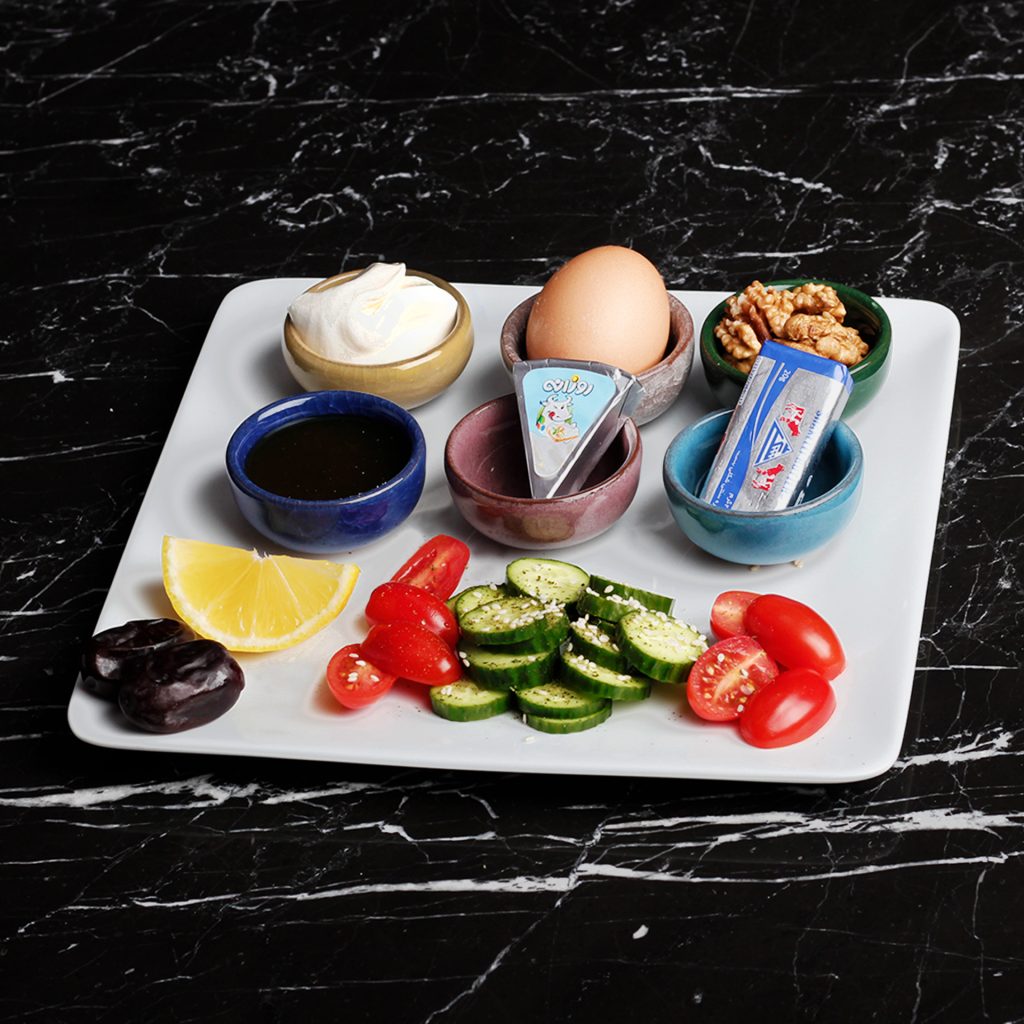 تخم مرغ+کره+پنیر+گوجه+خیار+خامه+مرباهویج+خرما+گردو